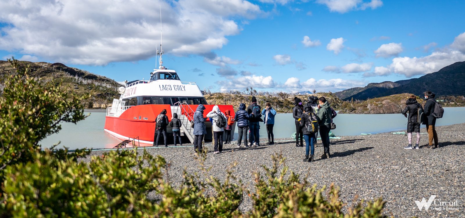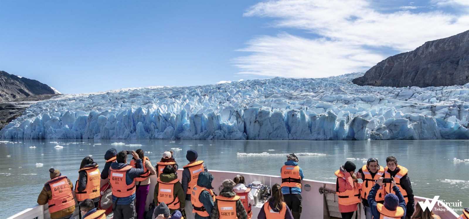 Durante el recorrido se observan témpanos flotantes, vegetación nativa y una vista frontal del Glaciar Grey, parte del Campo de Hielos Patagónicos Sur, junto a la cara oeste del Macizo Paine.